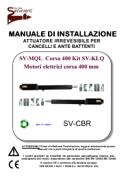 Automatismo per cancello ad 1 o 2 ante battenti: Motore/i della serie LINEAR. La corsa del carrello autobloccante va da 300 a 500 mm. Motori adatti per anta da 1,5 a 3,0 metri. ed ha una spinta di 2 Quintali. Non necessita di Elettroserratura; che comunque consigliamo quando il cancello è a Vela ed è installato in una zona ventilata, in questo caso consiglimo la Elettroserratura SS-EVA, se il cancello a 2 ante, raccomandiamo anche il paletto blocco d'anta SV-PAM. Importante Prevedere le scatole di derivazione sulla colonna per collegare il motore e il suo condensatore, tramite fusibile; in caso di cortocircuito del motore si evita il danneggiamento della centrale. La centrale SV-CBR è provvista di ricevente radio 433,92 MHz, è dotata di un’innovativa procedura di autoapprendimento dei codici di sicurezza; memorizza: 250 radiocomandi Rolling Code serie SV-TRC. Selezione delle prestazioni: chiusura automatica; passo passo; attivazione colpo d'ariete per agevolare lo sblocco della elettroserratura; Regolazione della Forza lavoro e dei rallentamenti; Uscita lampeggiante oppure a luce fissa; rallentamento in apertura ed in chiusura. Impostazione dei principali parametri. Regolazione tempo di pausa; sensibilità del controllo ostacolo e sfasamento di anta. Apertura totale o pedonale, funzione automatica o uomo presente. Uscita Alimentazione Accessori come Fotocellule. Uscita per Elettroserratura 12V 15W. Uscita: lampeggiatore a lampeggi differenziati, uscita per luce di cortesia 220 V. 500 W. utile per collegare un impianto esistente. Tutti i nostri prodotti sono costruiti nel rispetto delle Direttive Europee: R&TTE 99/05/EC CEE 89/336 + 92/31 +93/68 D.L 04/12/1992 N 476 e successive modifiche, in continuo aggiornamento. Prodotto assemblato e selezionato nello stabilimento della Securvera Roma. Garantito a norma di Legge contro difetti e vizi di fabbrica.